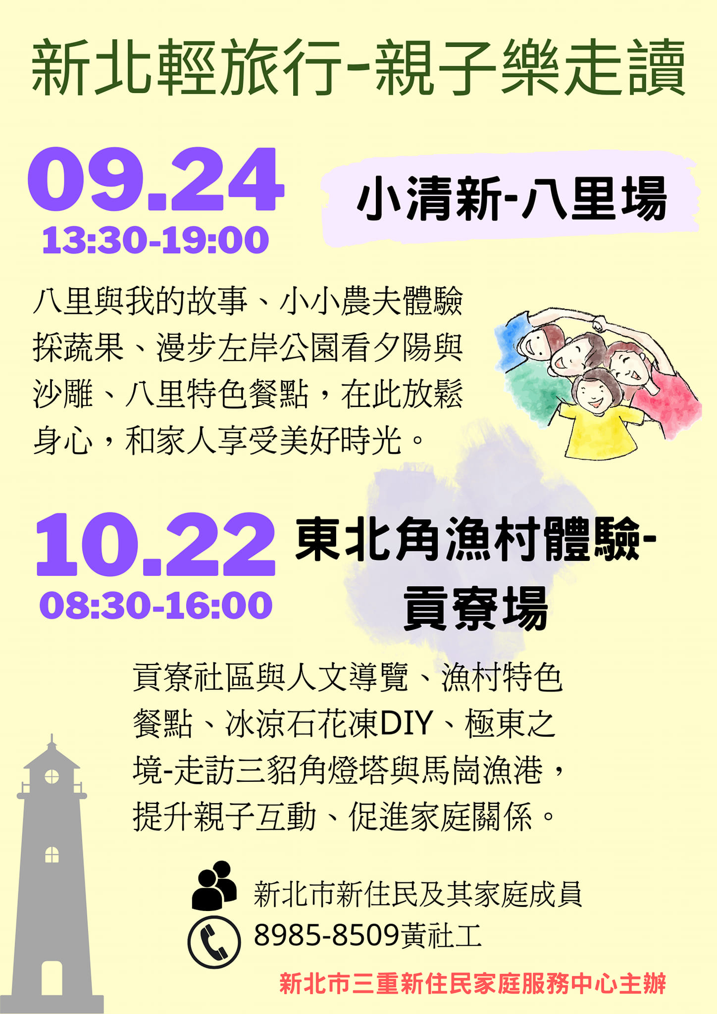 工作好忙碌、假日宅在家,邀請您和家人、孩子們一起參加親子活動,走訪新北市八里區、貢寮區,增進家庭親子關係、與社區連結、舒緩日常生活壓力,創造親子共同旅遊與學習時光