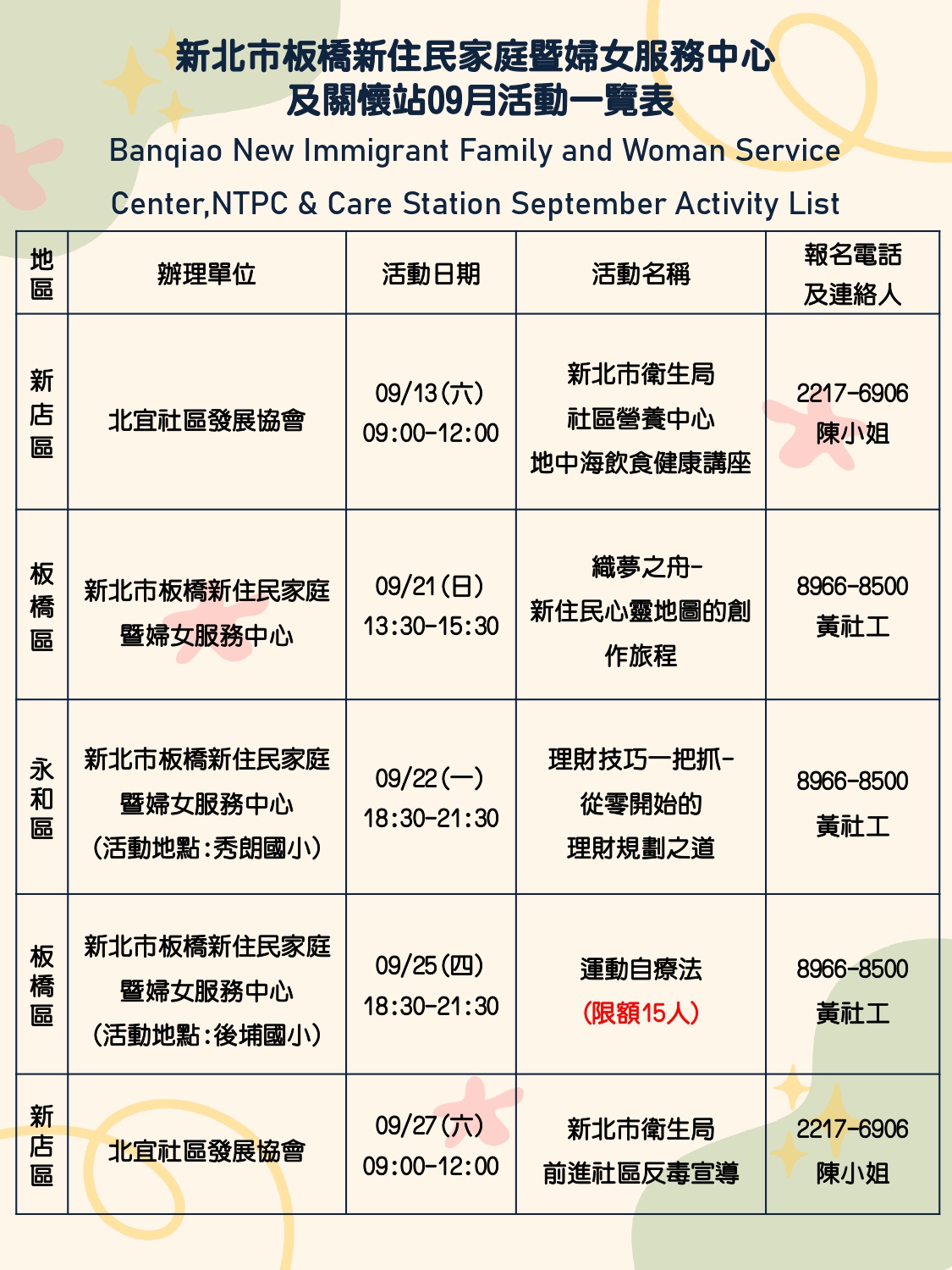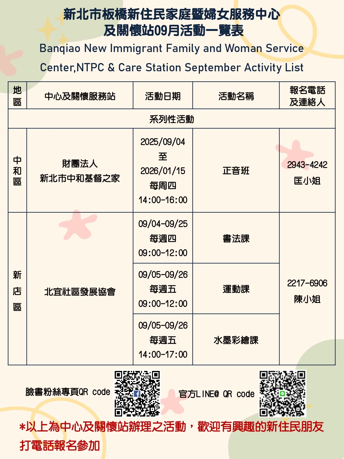 9月份板橋新住民中心及相關單位的活動一覽表出來囉!!