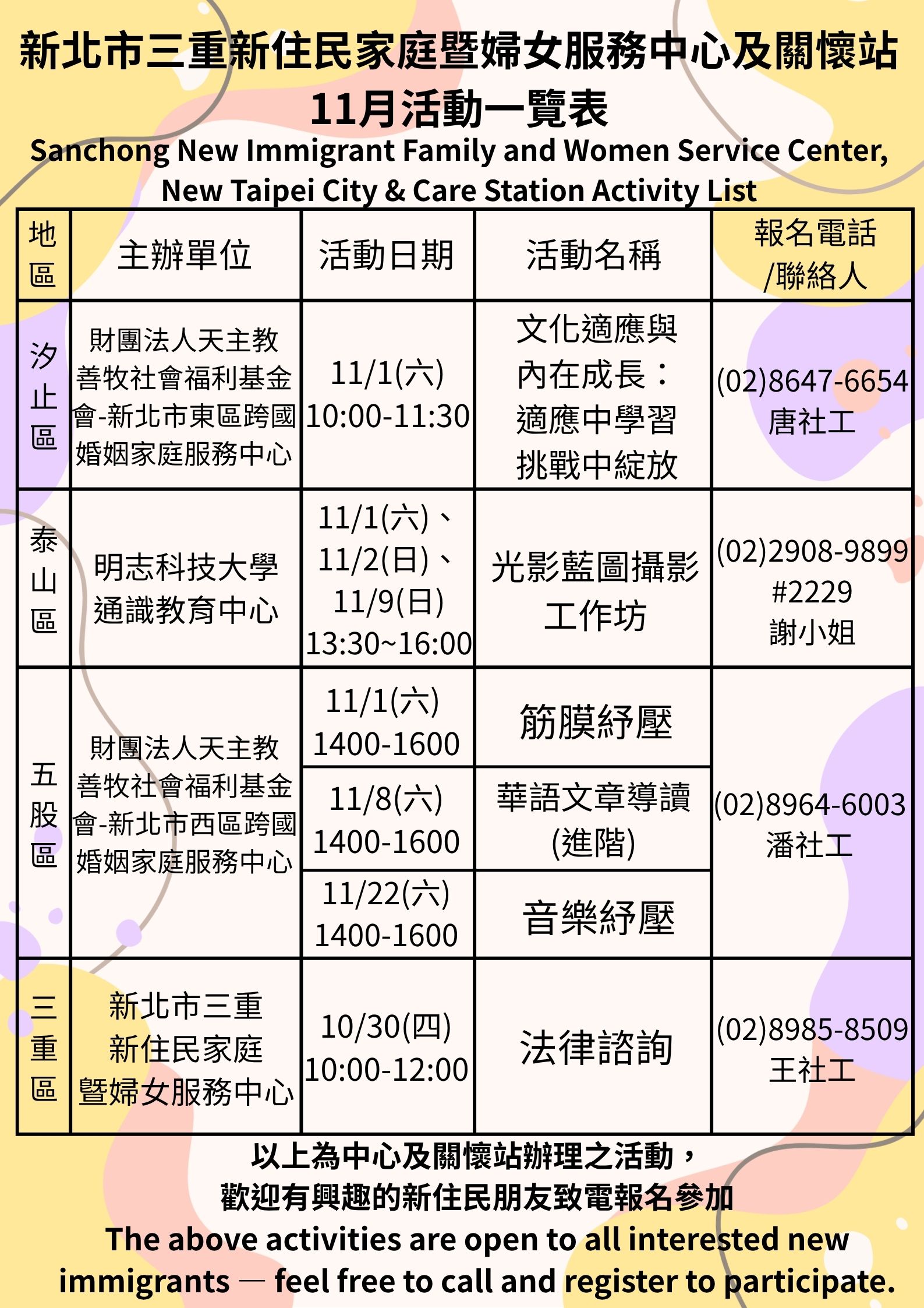 三重新住民家庭暨婦女服務中心與各區家庭關懷服務站準備了多樣化活動,伴大家在秋日中持續學習、成長與放鬆!