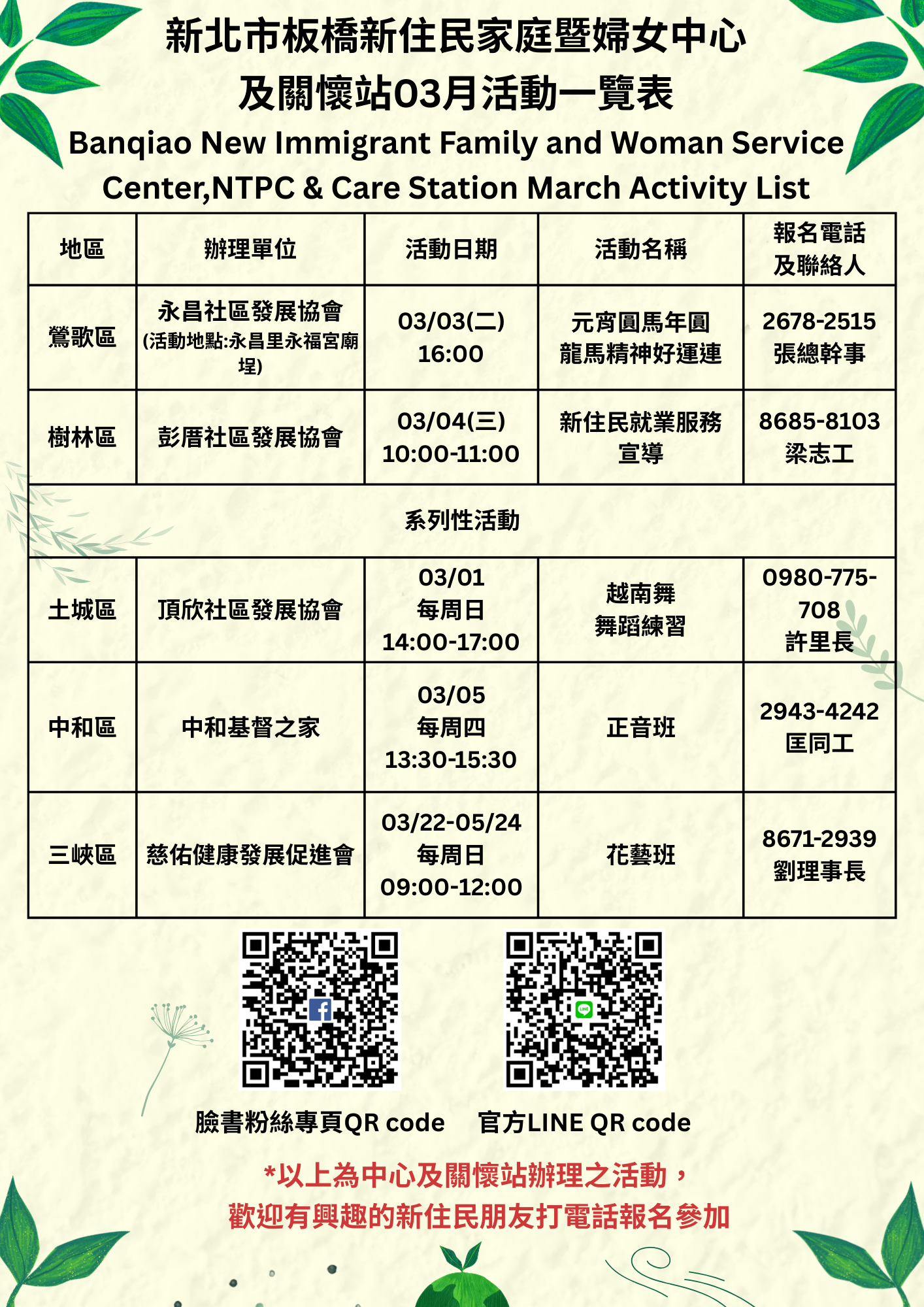 03月份板橋新住民中心及相關單位的活動一覽表出來囉!!